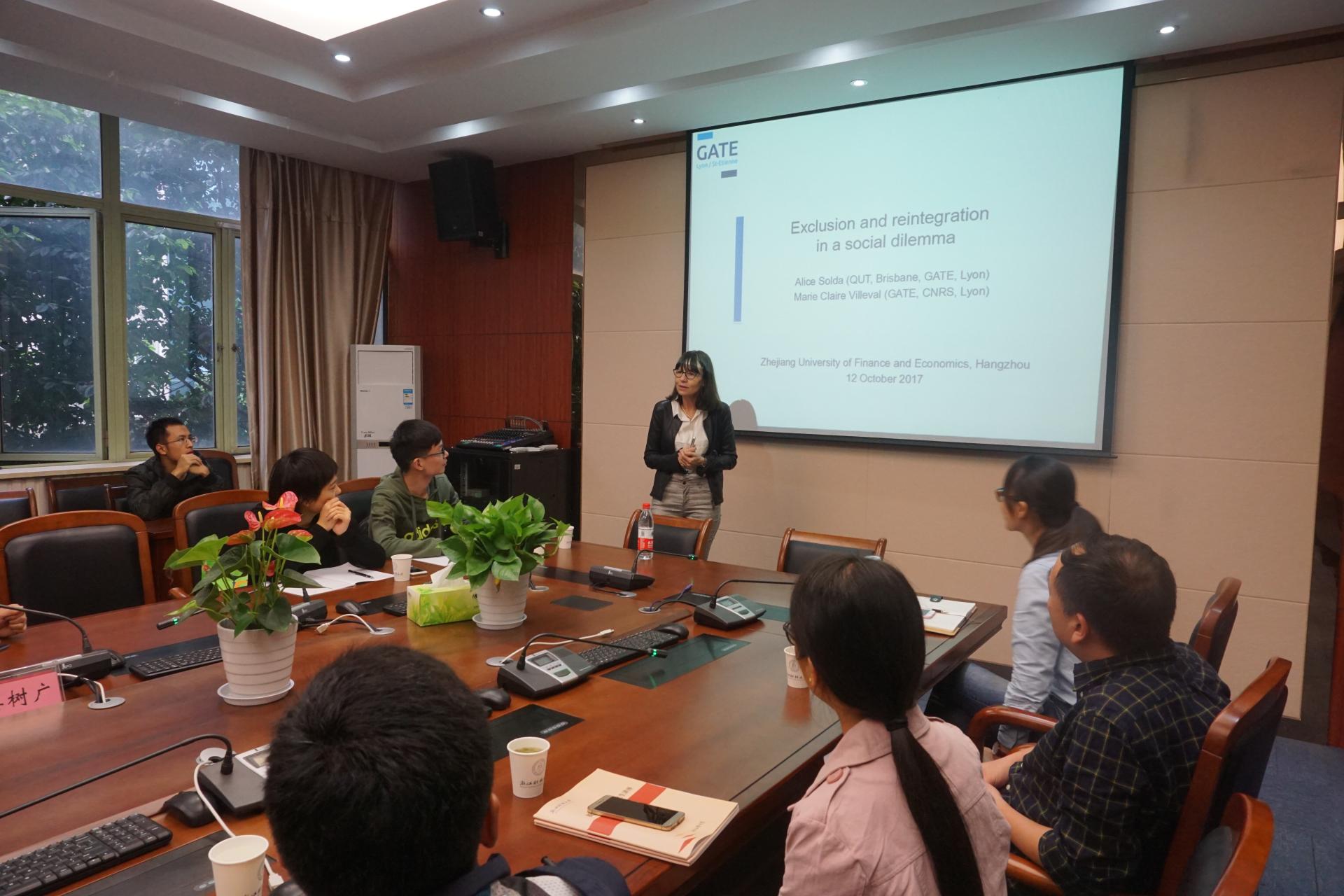 2017年10月12日,欧洲科公司院士、法国国家科公司特级教授Marie Claire Villeval女士莅临公司访问。上午,Villeval教授参观了公司经济行为与决策研究中心,对中心一流的软硬件条件给予了高度评价并提出了发展建议。下午,Villeval教授为公司师生献上关于“Exclusion and Reintegration in Social Dilemma”的学术报告和“关于如何在国际期刊发表学术论文”的经验讲座。讲座由意昂2青年教师姜树广博士主持。公司部分青年教师和研究生参加了讲座。