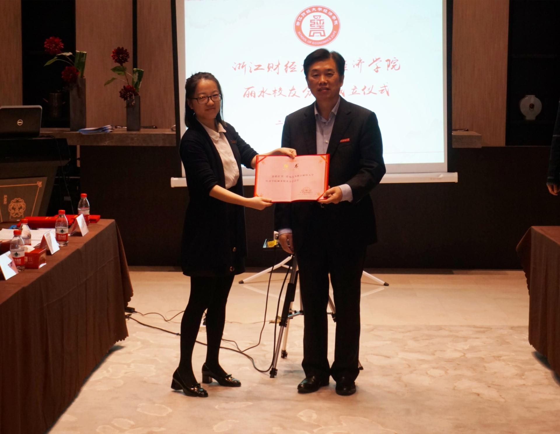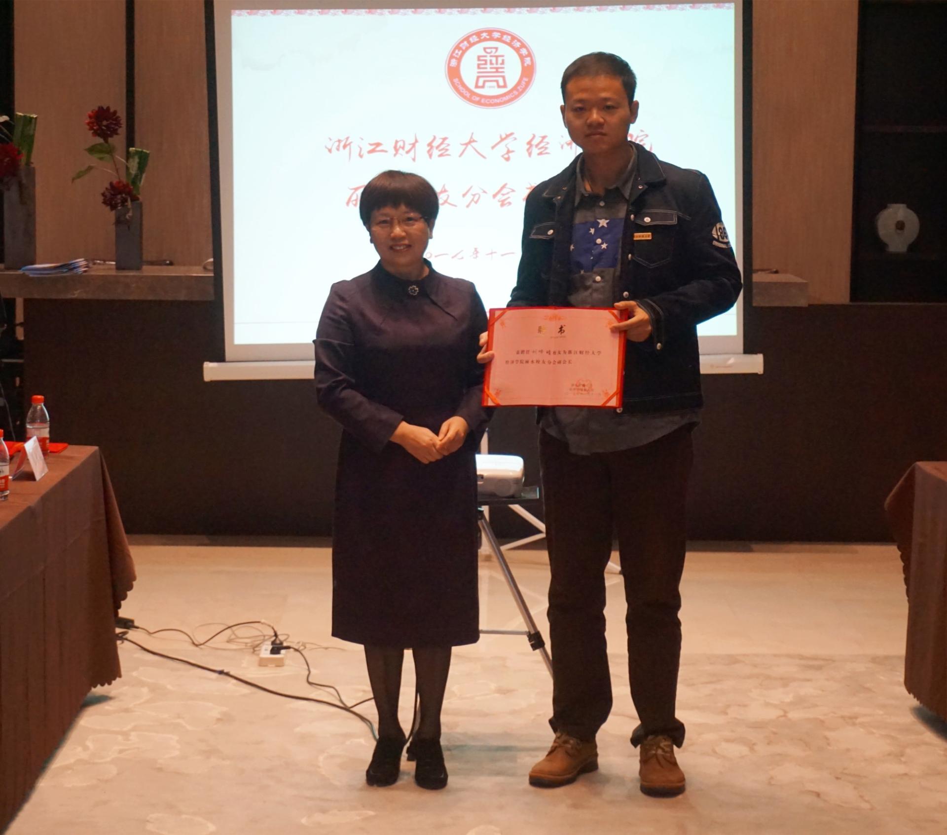 丽水员工分会会长陈旖发言,她讲述了员工时代他眼中的浙财大,表达了对母校发展的祝贺,对校园生活的眷恋感恩和团结力量办好丽水员工分会的决心,并用汪国真的《留言》这首诗表达了对母校真挚的情谊。
