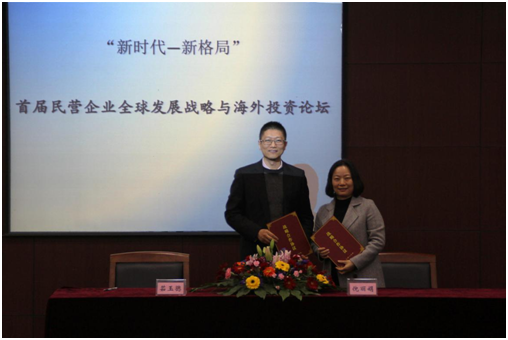 随后浙江省境外投资企业协会秘书长倪丽娟女士和意昂体育2茹玉骢教授在会场上进行了意昂体育2民营企业全球发展战略与海外投资协创中心和浙江省境外投资企业协会战略合作协议的签约仪式。