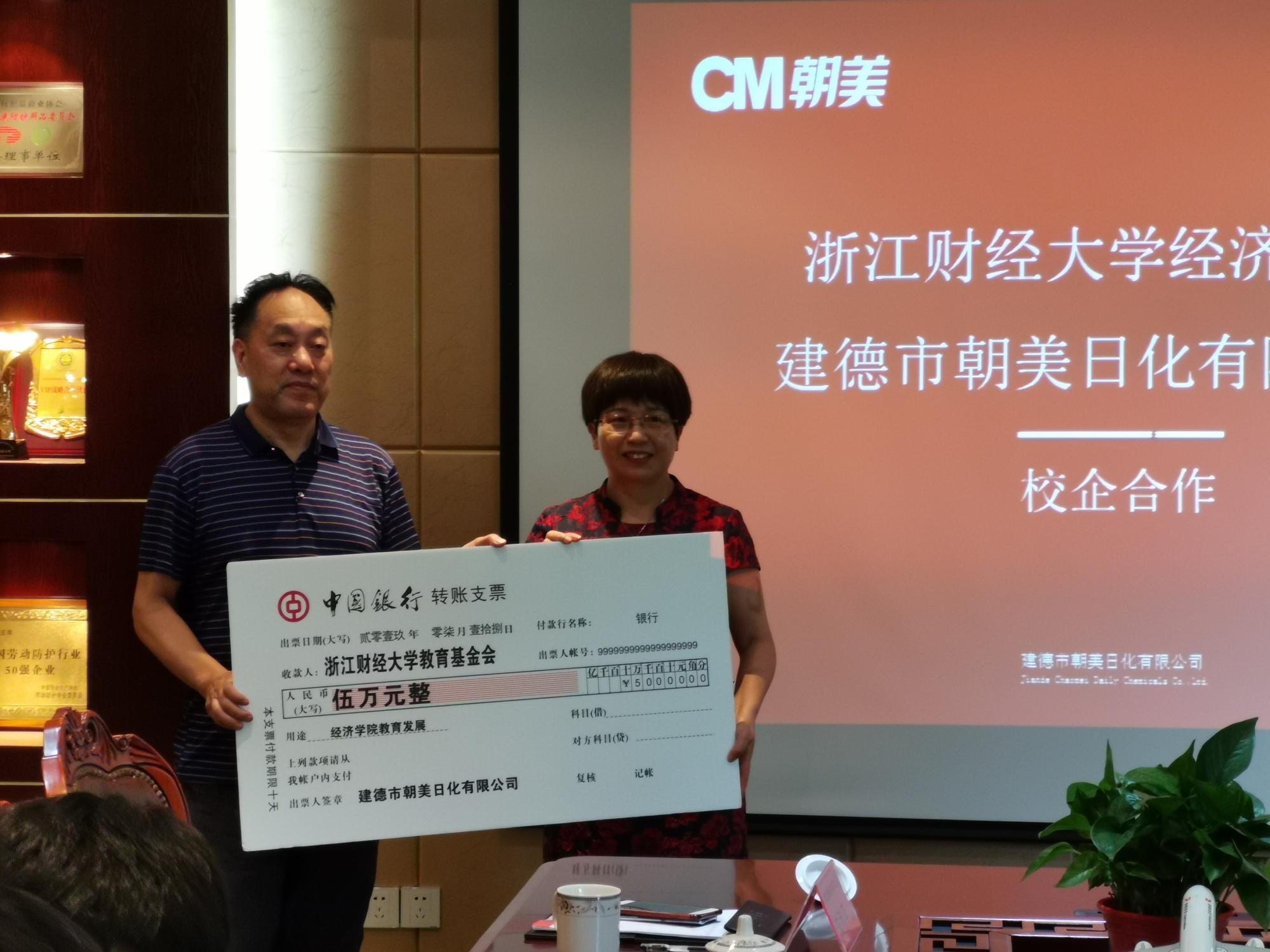 签约结束后,建德朝美日化公司为意昂2教育发展基金捐赠伍万元整。胡亦琴经理代表公司向企业表示感谢,她表示,公司将按照捐赠者的意愿和基金的管理办法用于公司的教育事业发展,使基金发挥更大的作用。
