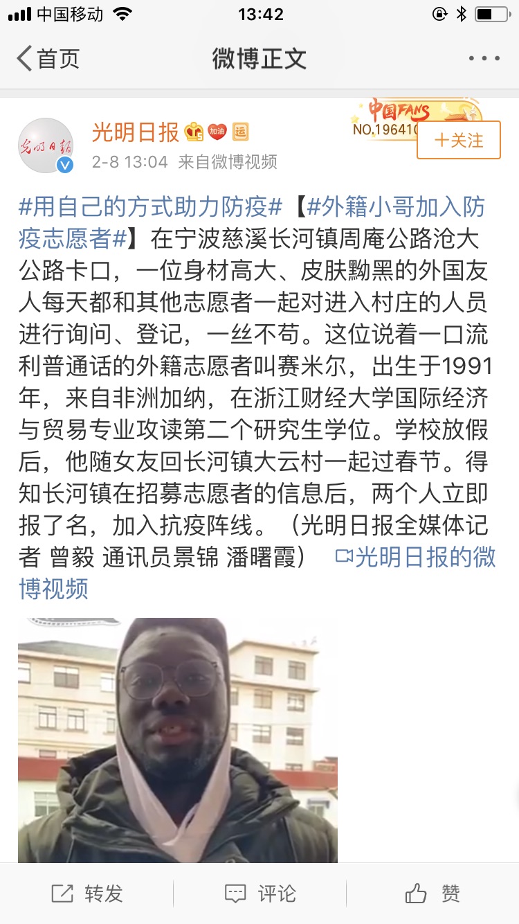 公司团员青年朱李灵同学在看到疫情之后,第一时间联系公司团委“一元钱”工程的负责人,表达自己想用压岁钱购买应急物资,驰援疫情防控一线的心愿,终于通过校团委辗转来回采购了3000个口罩,最终在2月4日下午送到了杭州火车东站工作人员手中,为正在迎接春运返程高峰、奋战在抗击疫情一线的工作人员送上温暖与祝福。公司职工、国际经济与贸易专业研究生塞米尔,得知宁波慈溪长河镇在招募志愿者的信息后,立即报了名,主动参与当地的疫情宣传和防控工作。他说:“疫情当前,不分国籍,大家都应尽自己的一份责任,共同为中国加油。”目前,公司共有50余位师生进行了捐款,金额或物资达到万余元。