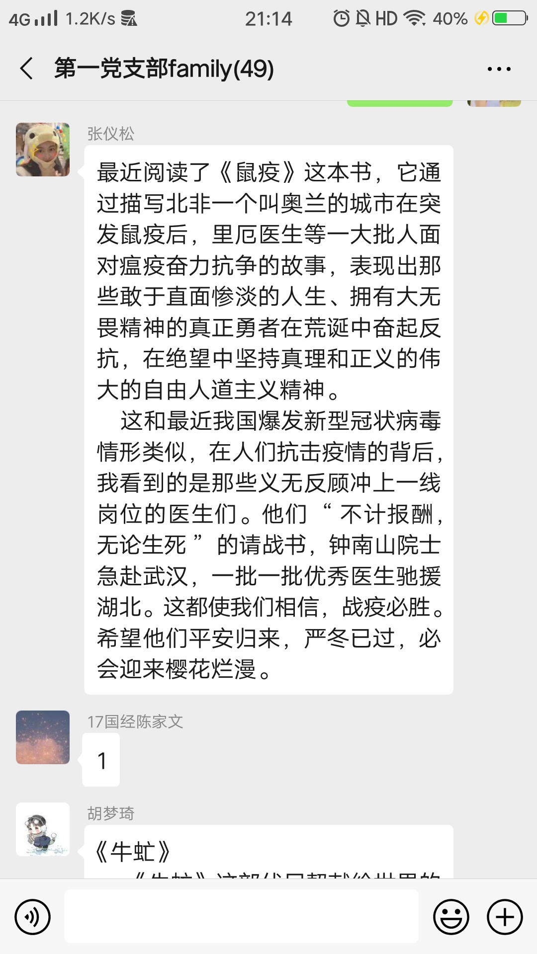 本科生第三党支部在疫情发生后立刻行动,开展《就业季遭遇疫情,摆正就业心态》分享活动,分析当前国家就业形势,分享疫情当下正在开展线上招聘活动的相关信息,鼓励大家在特殊时期调整心态,利用网络资源,进行简历投递和线上面试,积极推进自身就业计划。本科生第一党支部结合支部“读书会”特色,全体党员针对疫情开展“云分享”,对《瘟疫与人》、《看见》、《鼠疫》等多部书籍进行分享。大家传达书中的精神内涵,进行反思和追问,探寻合理有效的解决办法,在疫情面前争做有理性、有思想、有作为的新时代老员工。在企业面临复工的情况下,研究生第一党支部以党小组为单位,发挥专业优势,围绕“企业复工”和“疫情防控”两个主题,针对“企业复工”的相关文件进行研究讨论,结合经济理论和疫情实际,分析目前多省复工的开展情况并交流想法。因疫情影响,今年研究生录取工作也有所延迟,本科生第五党支部抓住当前考研热点,在考研分数线公布后立即行动,联系采访了近年考取相应公司专业的学长学姐,以“前辈说”为主题为今年考研同学带来了复试准备攻略,整理后在支部书记曹仲晔老师公众号“辅导员摸摸头”上进行“云分享”,系列分享推送被1000余人浏览,受到同学们好评,并被兄弟院校转发分享。