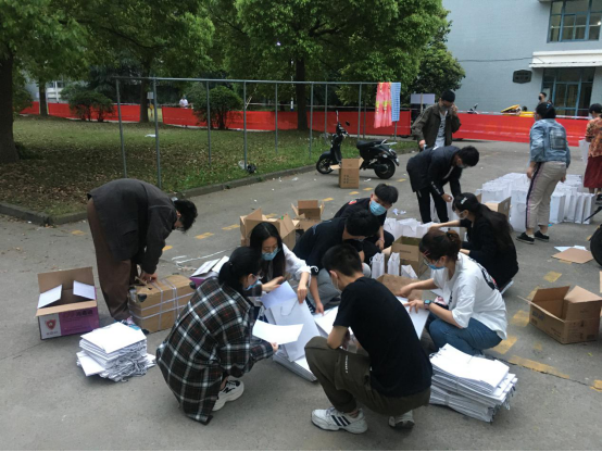 返校前夕,公司志愿者们线上开会分工、制定方案,以保证公司各年级同学返校流程的顺利进行。5月7日,志愿者们整理分装公司为同学们准备的“防疫暖心包”。