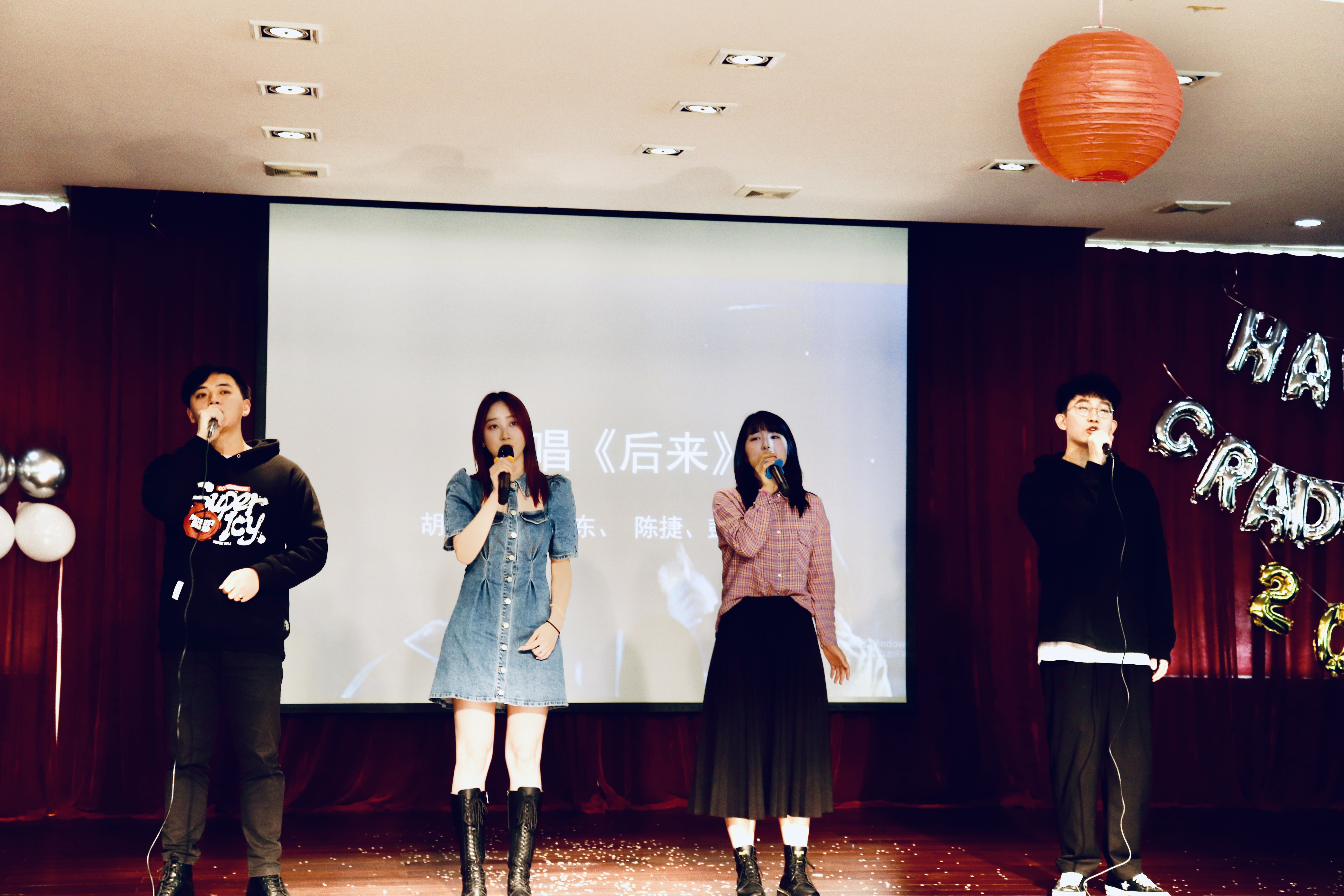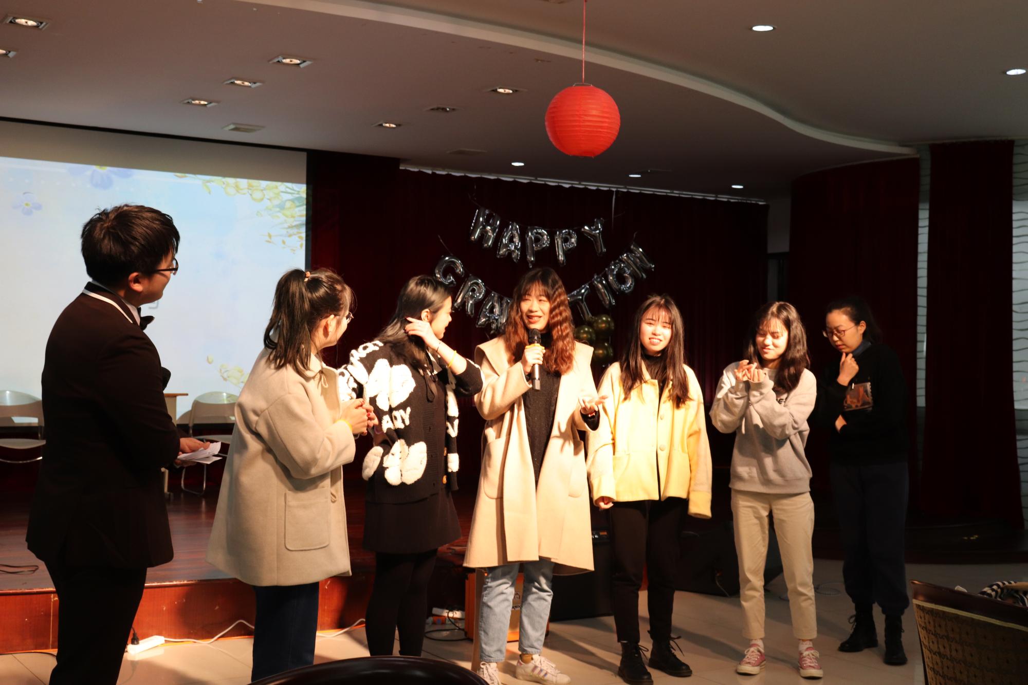 院研究生会的《毕业惊喜》小品融入了同学们的老员工活,表达了对爱情和友情的珍惜,真诚恳切。舞台剧《我不想毕业》,圈圈年轮,历历足迹,唱响青春之歌,放飞纸飞机,将晚会推向了高潮。晚会中增加了游戏互动环节。最后,伴随着合唱歌曲《后来》,本次毕业生晚会圆满落下了帷幕。