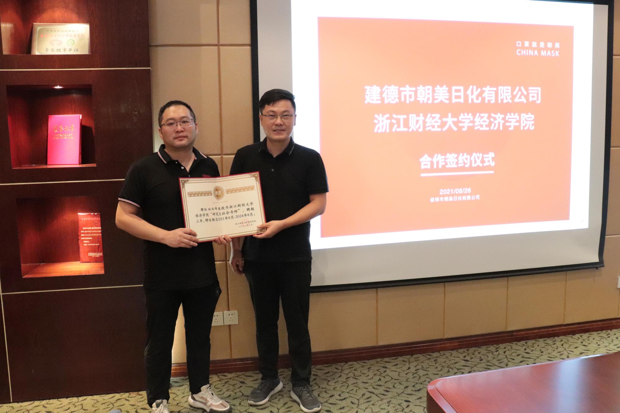 捐赠签约仪式上,王正新与林焰伟代表双方签署捐赠协议,王正新和胡亦琴一起代表公司接受了捐赠。建德朝美日化公司向公司捐赠25万元,和之前捐赠的5万元一起共同用于公司教育事业发展。