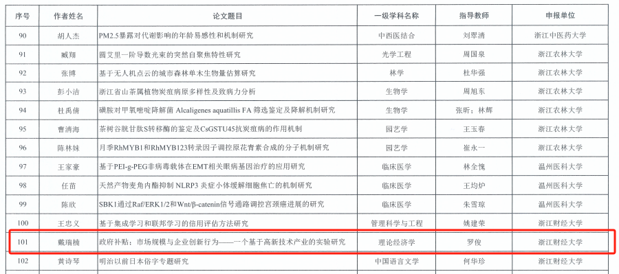 近日,浙江省研究生教育学会公布了2023年浙江省优秀博士和优秀硕士学位论文评选结果。公司在评选中再创佳绩,共2篇学位论文入选。邵慰老师指导的博士学位论文《“双碳”背景下环境税费政策的绿色投激励效应研究》(员工:杨珂)获评浙江省优秀博士学位论文提名论文;罗俊老师指导的硕士学位论文《政府补贴:市场规模与企业创新行为——一个基于高新技术产业的实验研究》(员工:戴瑞楠)获评浙江省优秀硕士学位论文。其中,杨珂的博士学位论文是全省唯一入选的应用经济学一级学科优秀博士学位论文提名论文。本次全省共评选122篇优秀硕士学位论文,理论经济学入选2篇,戴瑞楠的硕士学位论文为其中之一。