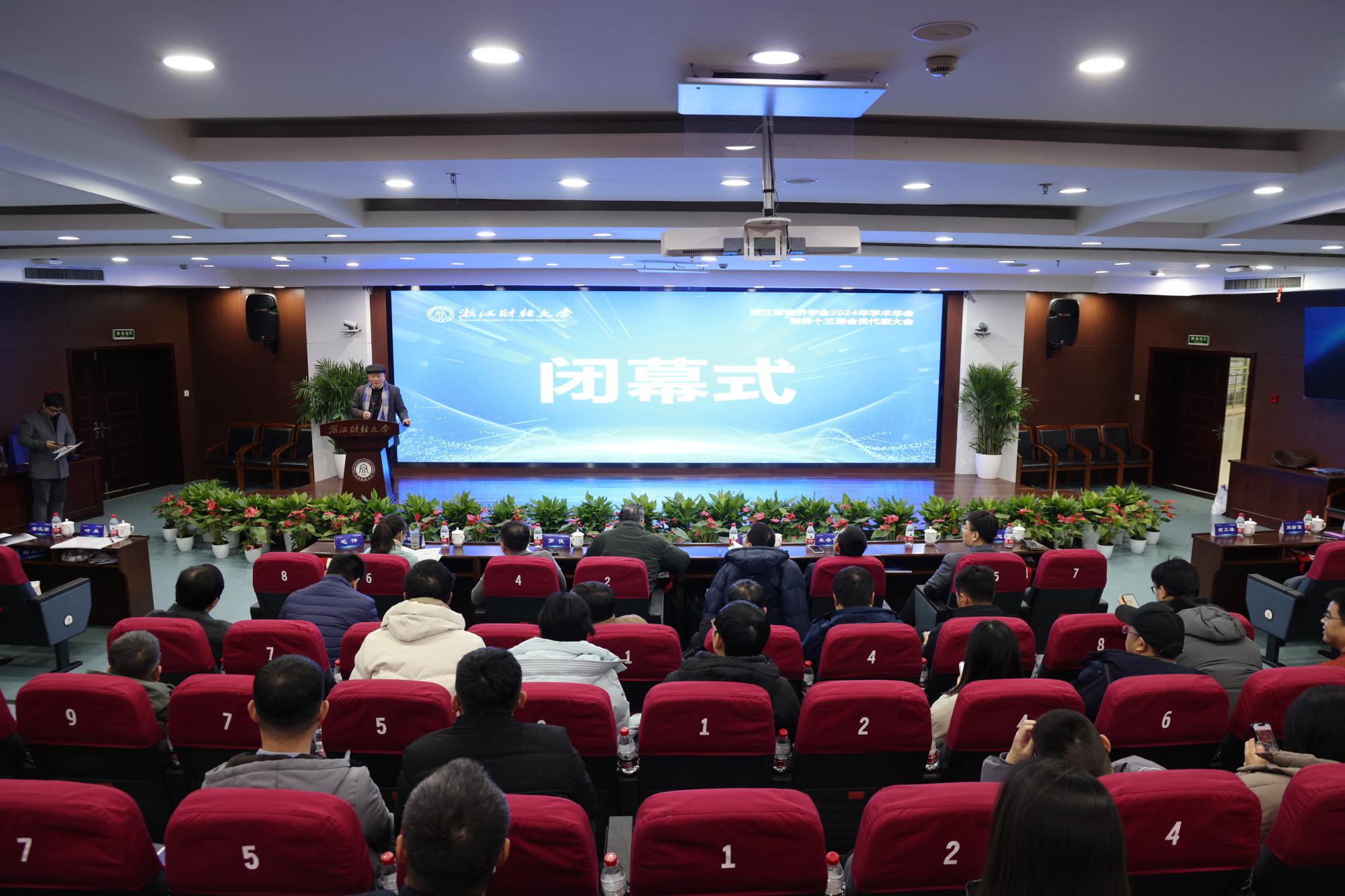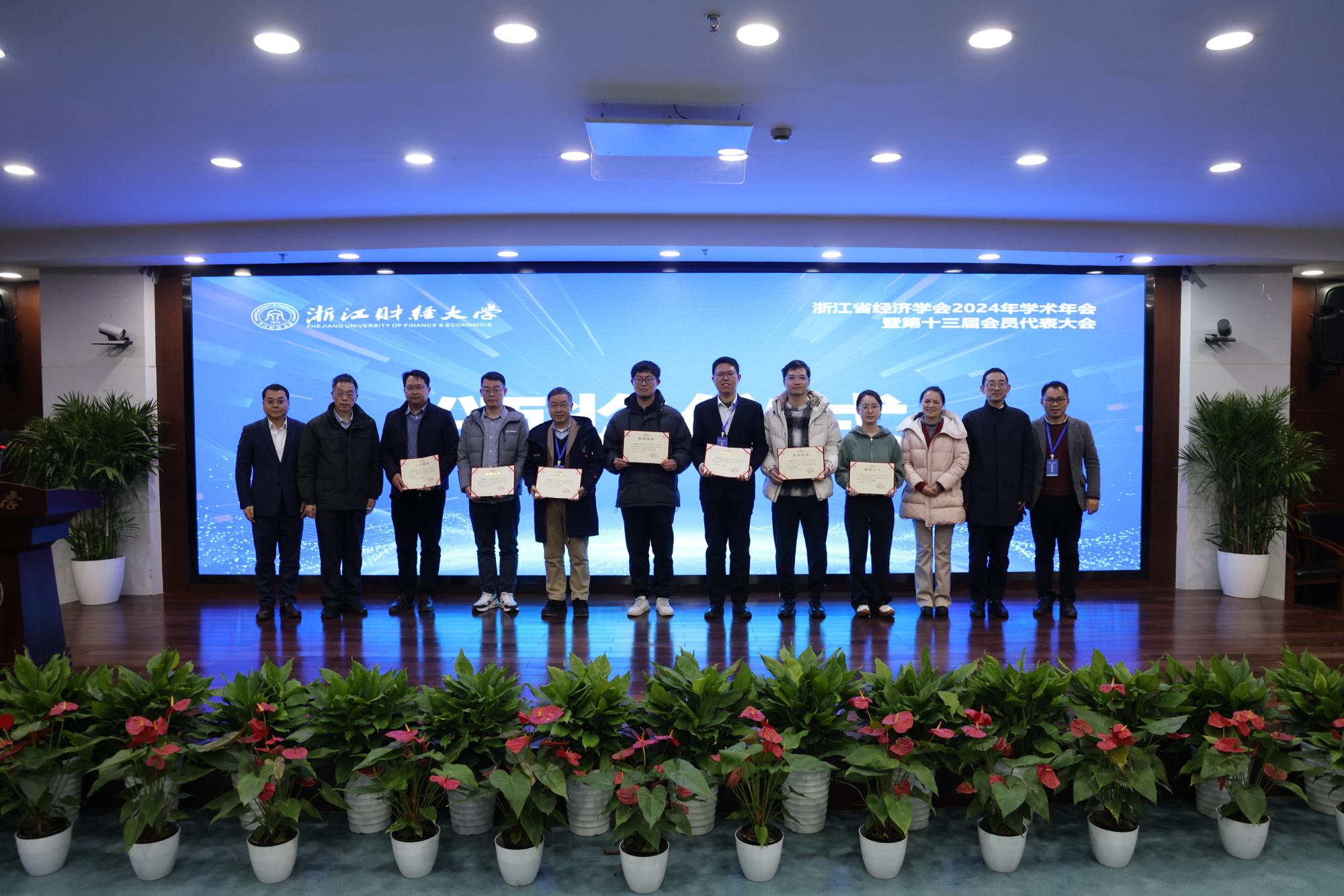 在闭幕式环节,举行了2024年度浙江省经济学会优秀成果、优秀论文、优秀组织奖的颁奖仪式。浙江省经济学会第十三届理事会会长潘士远教授对本次年会进行了总结,介绍了新一届理事会领导及工作思路,并对本次年会的组织工作进行了充分肯定。省经济学会理事会副会长周新苗教授代表下一届省经济学会学术年会的承办方宁波大学作邀请发言。最后,闭幕式主持人、省经济学会理事会秘书长叶兵对各位参会嘉宾、学会同仁与同学们表示衷心感谢,并宣布浙江省经济学会2024年学术年会胜利闭幕。