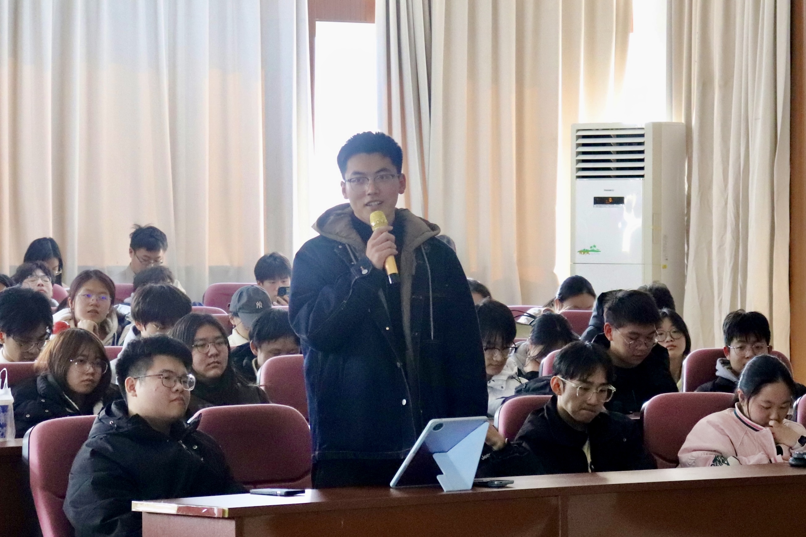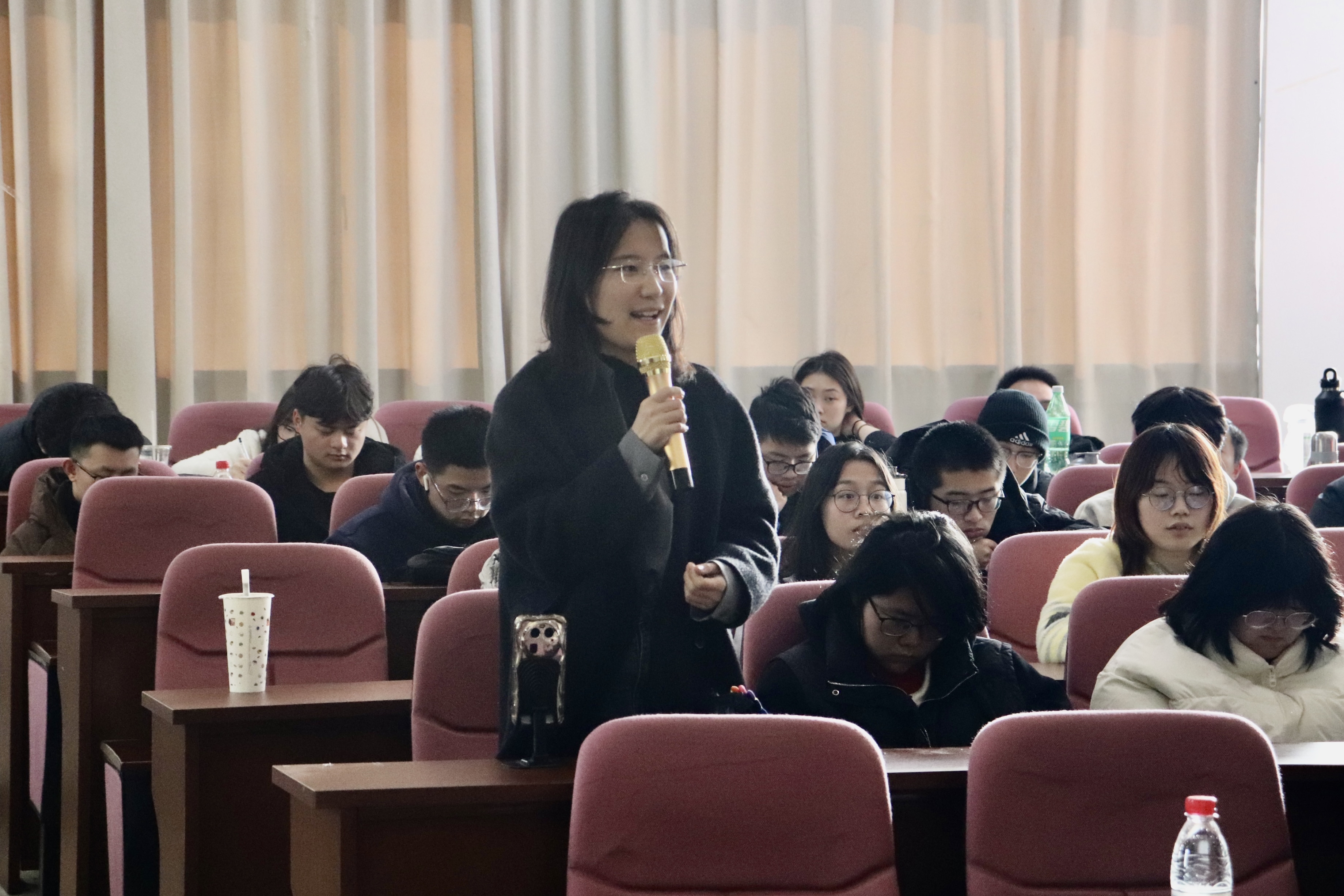 在交流互动环节,来自24数字贸易创新1班陈庆煜认为旅行和记录生活能够让自己感到幸福,并和大家分享了自己的幸福密码。23经济学创新班的刘小鸣认为能够从文学和历史相关书籍中探寻幸福的秘诀。意昂2经理罗俊和朱西湖老师针对同学们的回答展开了进一步的探讨。
