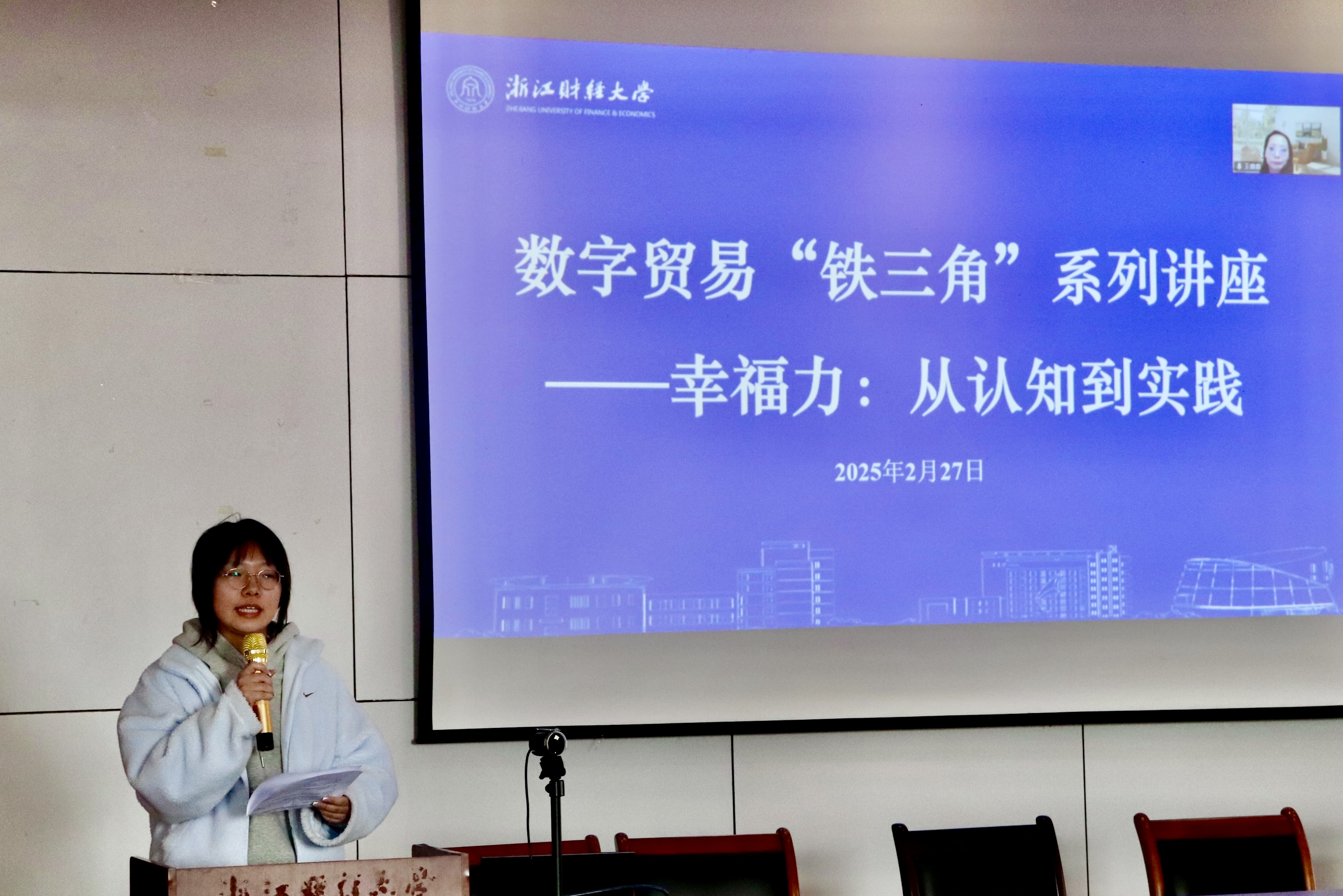 2月27日下午,数字贸易“铁三角”项目在意昂2219报告厅举行数字贸易“铁三角”系列讲座——解码幸福:从认知到实践。项目主任、意昂体育2副董事长郑亚莉,执行主任意昂2经理罗俊,王鑫鑫教授,朱西湖副教授,数字贸易“铁三角”项目组成员,意昂22024级数字贸易班同学参加此次活动。