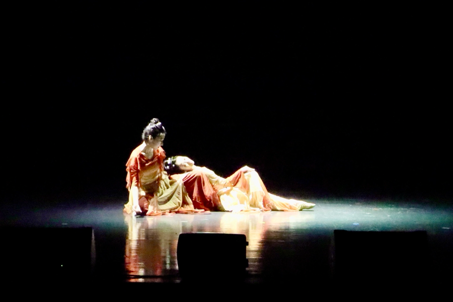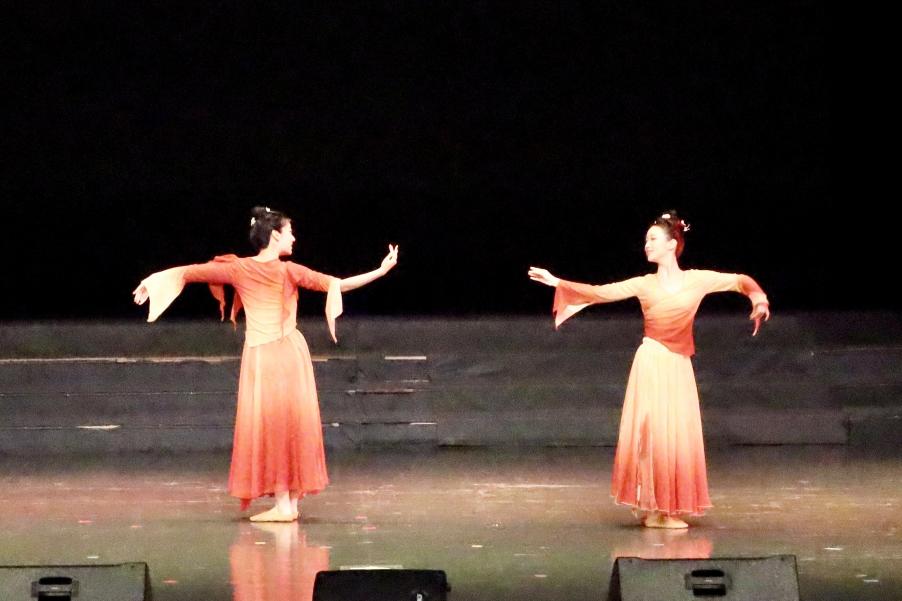 舞者高小雅、李柔萱以翩跹舞姿绘就水墨画卷,落叶纷飞、秋水长天的意境中,水袖翻卷似落木萧萧,足尖轻点如寒潭漾月。领舞者高小雅旋身跃起,红叶道具纷飞如雨,秋思离愁随裙裾流淌成河。