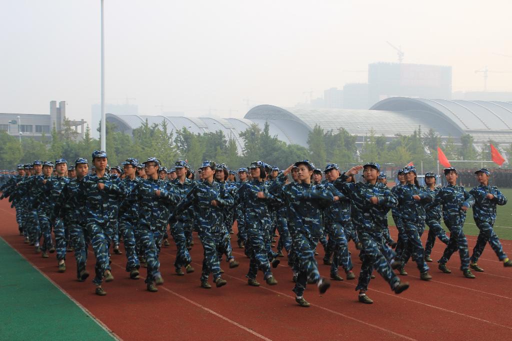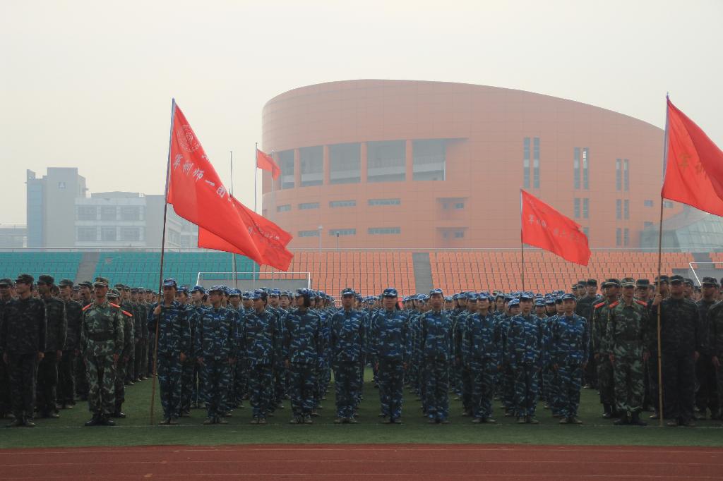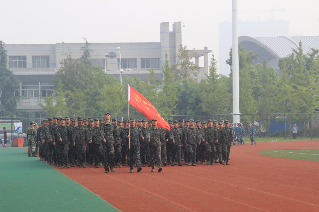 新生们早早地在操场列队,等待阅兵式的开始。清晨的阳光洒在他们的迷彩服上,柔和而坚韧。迎军旗、升国旗之后,军训师师长问候军训新生:“同学们辛苦了!”“为公司争光!”铿锵有力的回答响彻整个校园。