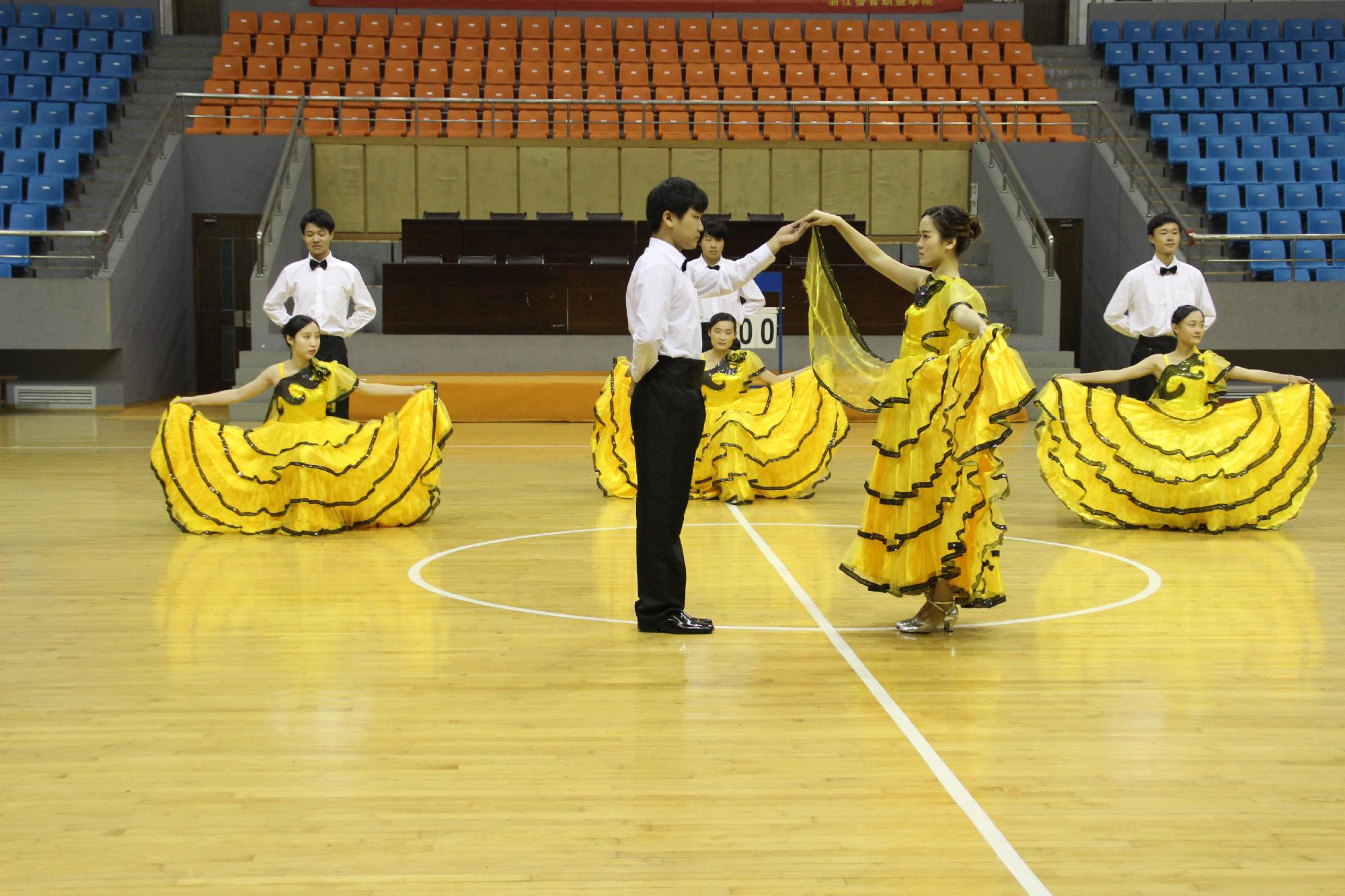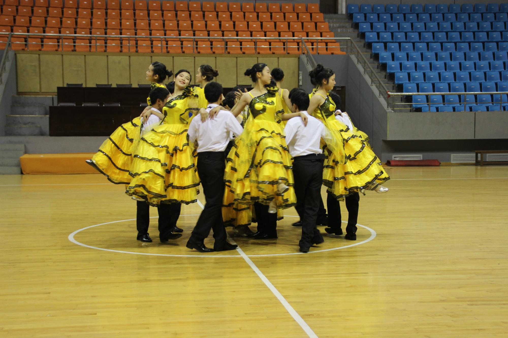 飘动的舞姿宣扬斑斓的青春,华美的舞姿配上优雅的旋律。经贸公司的才子佳人们上场了,黄底黑带的长裙轻轻飘起,黑色燕尾服的绅士优雅地邀请女伴。炫目的队列变换复杂却又整齐,一次次的托举和旋转引得全场惊叹声一片。在这个赛场上,每一个转身、每一个腾跃、每一个舞步的背后都是他们的汗水与付出。当然,队员们的辛勤付出也得到了应有的回报,最终获得华尔兹团体项目第三名的好成绩。