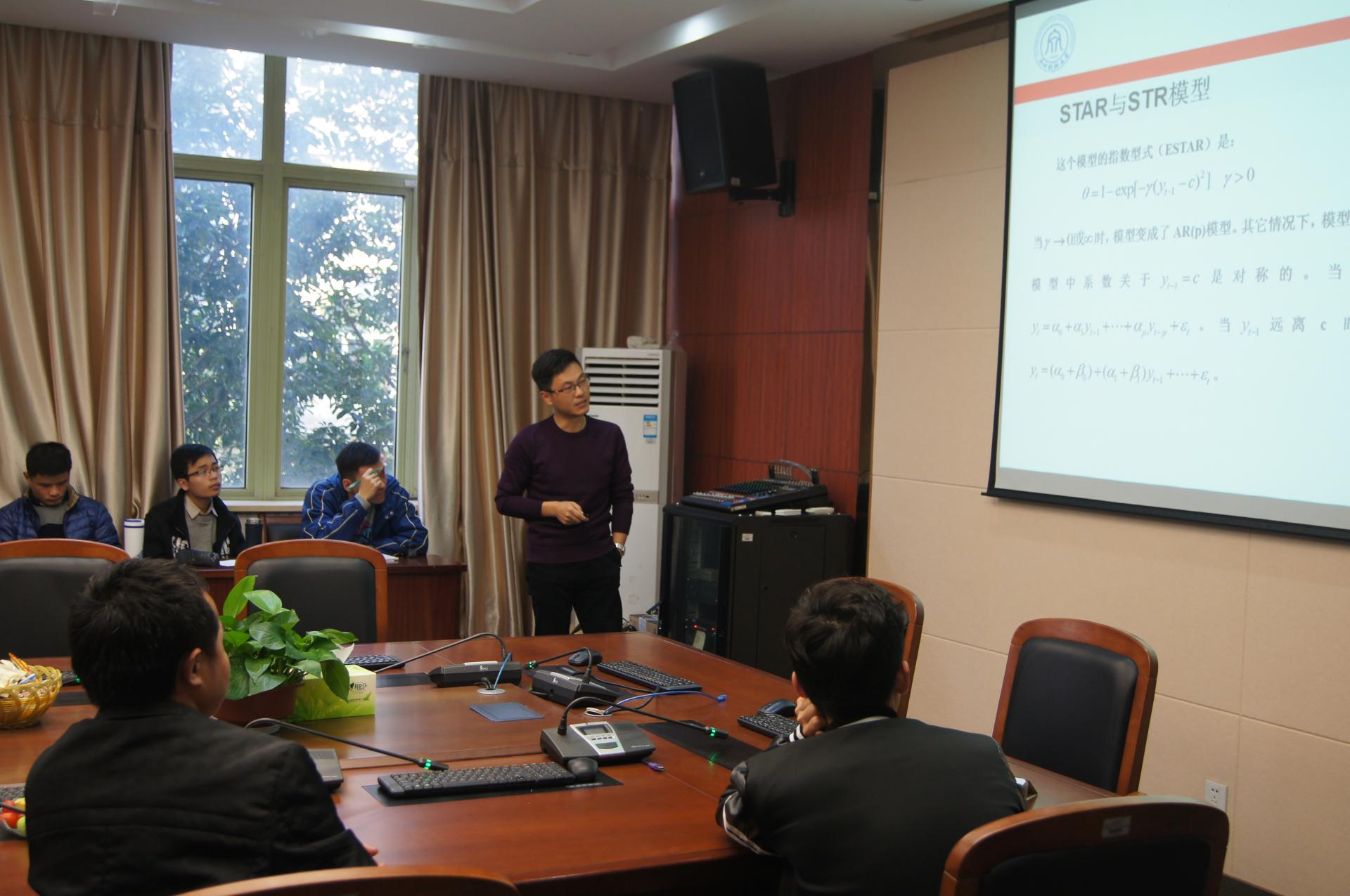 经济行为和经济系统运行过程的复杂性往往引起经济变量的非线性和非对称性的特征。因此刻画经济变量在不同状态间的非线性转换,捕捉经济系统中可能存在的结构性变化日益受到关注。王正新博士介绍了非线性模型的基本概念及其分类,其中平滑转移模型能够更好地描述机制转换的过程、处理结构性突变、捕捉非对称特征,因而被广泛应用于宏观经济和金融领域,并逐步拓展到向量回归、协整、面板数据建模。接着,王正新博士系统地介绍了时间序列平滑转移回归模型和面板平滑转移回归模型(PSTR)的理论及应用研究进展,其中包括平滑转换自回归模型(STAR)的两种形式(LSTAR和ESTAR)、STAR模型的检验、模型形式的确定及参数估计。对于PSTR模型,王正新博士认为可以从两个角度理解:(1)PSTR模型为异质变系数线性面板模型,异质性表现为模型系数围绕某个解释变量的连续有界函数发生变化;(2)PSTR模型可以视为同质非线性面板模型。他认为在转换函数的形式、参数估计方法和异常值的处理等方面可以做进一步地研究。最后,王正新博士介绍了近期的研究成果:《“汇改”以来人民币实际有效汇率波动的非线性机制——基于平滑转移自回归模型的实证研究》和《创新效率对高技术产业出口复杂度的非线性影响——基于面板平滑转换回归模型》,并和在座师生展开讨论。