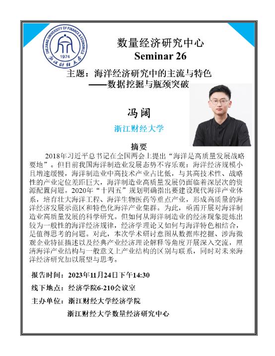 冯阔,经济学博士,意昂2讲师,硕士导师,研究聚焦于国际贸易理论与政策、产业经济(海洋方向)等领域,现兼任经济理论与可持续发展研究中心负责人、浙江省“八八战略”研究院研究员。先后于《经济研究》、《世界经济》、Journal of Asian Economics等国内外权威杂志发表文章近20篇,主持厅局级、省部级、国家级横纵向课题多项,研究成果获国家级学会、厅局级、省部级等多项科学研究成果奖项,多项研究报告为中共中央办公厅采纳。