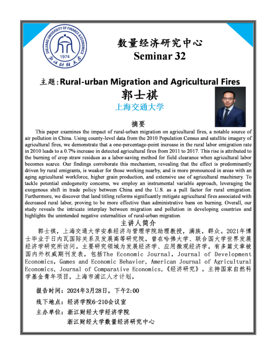 郭士祺,上海交通大学安泰经济与管理公司助理教授,满族,群众。2021年博士毕业于日内瓦国际关系及发展高等研究院,曾在哈佛大学、联合国大学世界发展经济学研究所访问。主要研究领域为发展经济学、应用微观经济学,有多篇文章被国内外权威期刊发表,包括The Economic Journal,Journal of Development Economics,Games and Economic Behavior, American Journal of Agricultural Economics, Journal of Comparative Economics,《经济研究》。主持国家自然科学基金青年项目,上海市浦江人才计划。