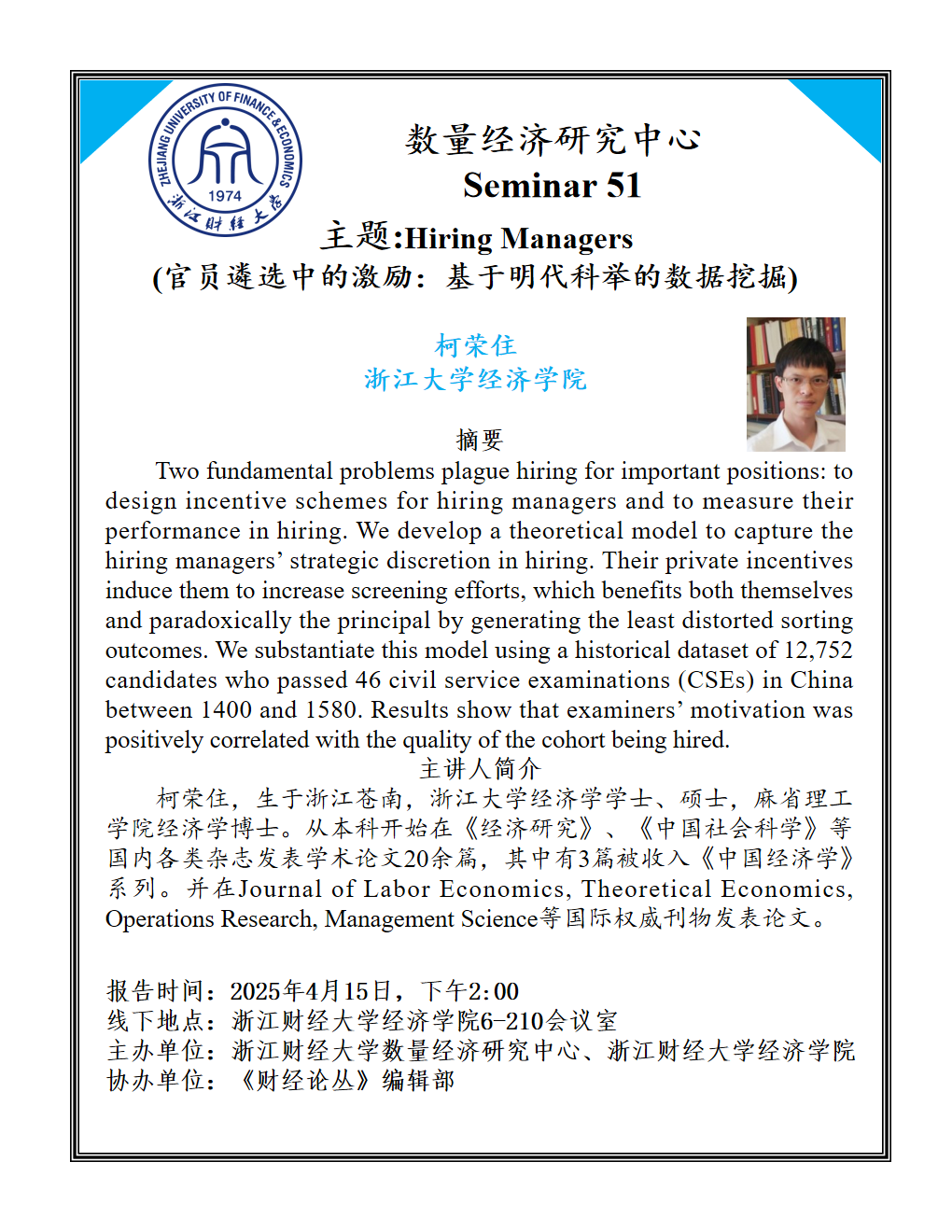 柯荣住,生于浙江苍南,浙江大学经济学学士、硕士,麻省理工公司经济学博士。从本科开始在《经济研究》、《中国社会科学》等国内各类杂志发表学术论文20余篇,其中有3篇被收入《中国经济学》系列。并在Journal of Labor Economics, Theoretical Economics, Operations Research, Management Science等国际权威刊物发表论文。