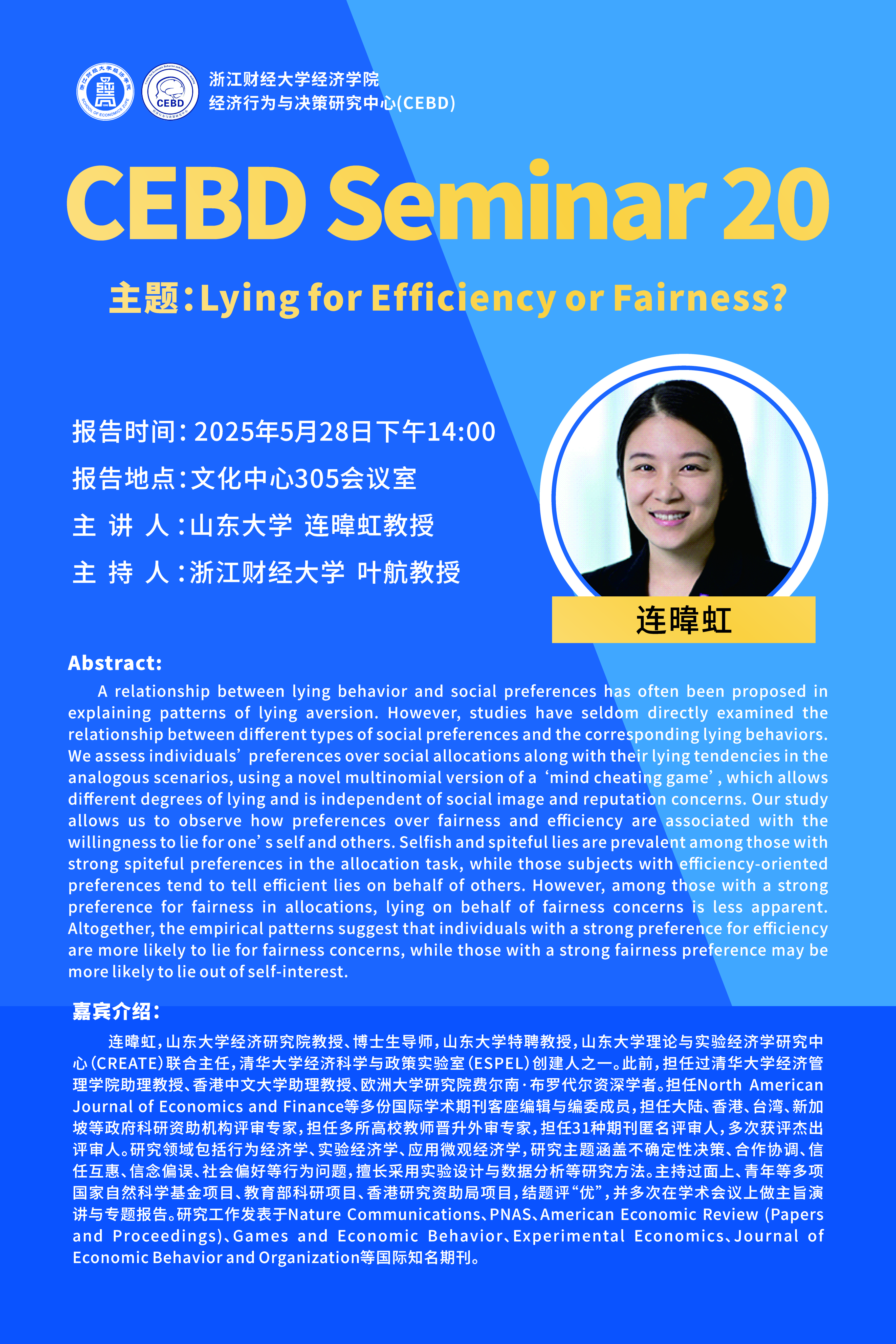 连暐虹,山东大学经济研究院教授、博士生导师,山东大学特聘教授,山东大学理论与实验经济学研究中心(CREATE)联合主任,清华大学经济科学与政策实验室(ESPEL)创建人之一。此前,担任过清华大学经济管理公司助理教授、香港中文大学助理教授、欧洲大学研究院费尔南·布罗代尔资深学者。担任North American Journal of Economics and Finance等多份国际学术期刊客座编辑与编委成员,担任大陆、香港、台湾、新加坡等政府科研资助机构评审专家,担任多所高校教师晋升外审专家,担任31种期刊匿名评审人,多次获评杰出评审人。研究领域包括行为经济学、实验经济学、应用微观经济学,研究主题涵盖不确定性决策、合作协调、信任互惠、信念偏误、社会偏好等行为问题,擅长采用实验设计与数据分析等研究方法。主持过面上、青年等多项国家自然科学基金项目、教育部科研项目、香港研究资助局项目,结题评“优”,并多次在学术会议上做主旨演讲与专题报告。研究工作发表于Nature Communications、PNAS、American Economic Review (Papers and Proceedings)、Games and Economic Behavior、Experimental Economics、Journal of Economic Behavior and Organization等国际知名期刊。