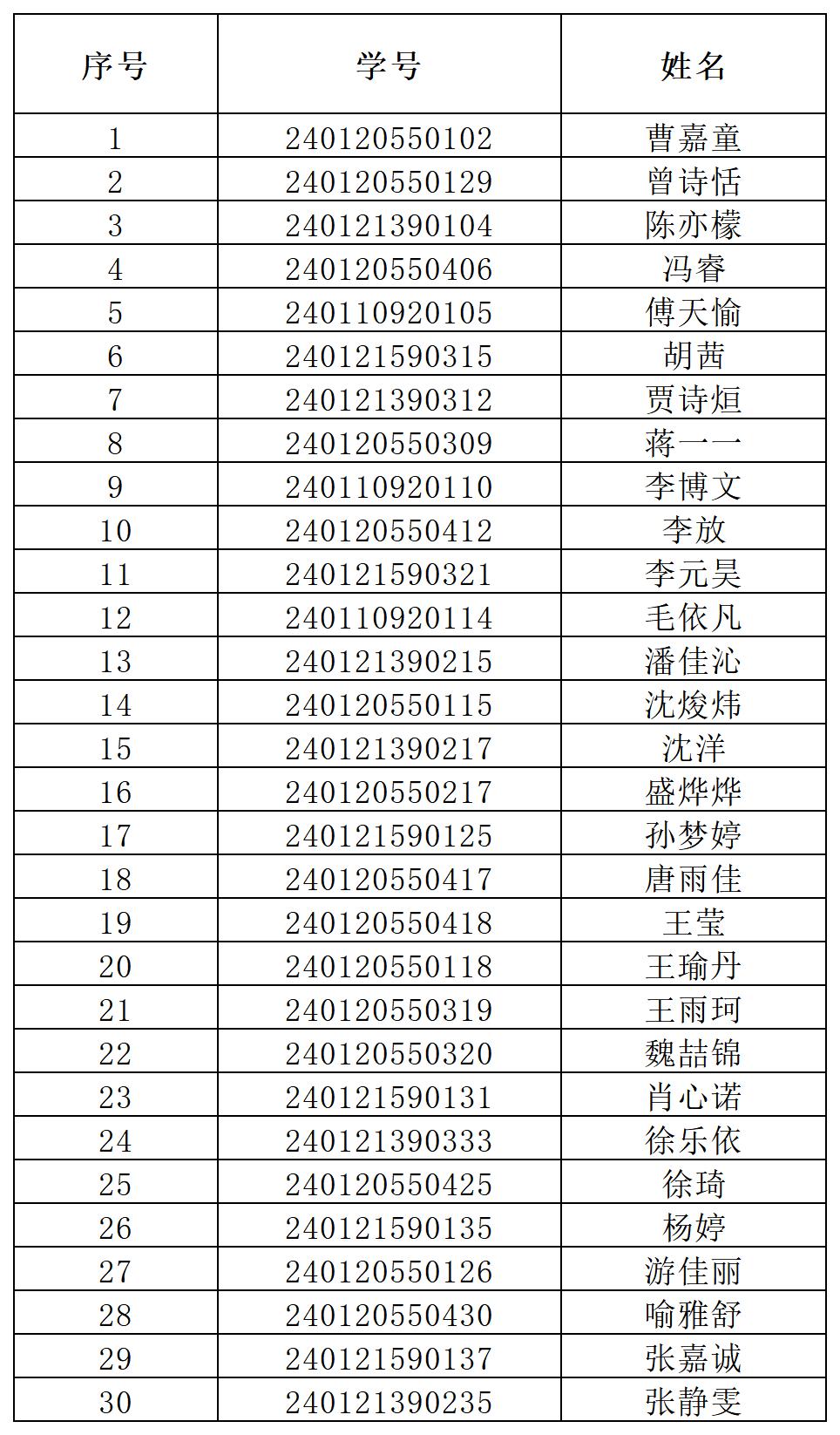 按照《关于经济学拔尖员工培养基地班2024级新生选拔的通知》相关规定,经自愿报名、入围筛选、综合面试、成绩复核以及面试工作领导小组审议,公司2024级经济学拔尖员工培养基地班预录取以下30人,现对预录取名单进行公示(按姓氏笔画排序)。