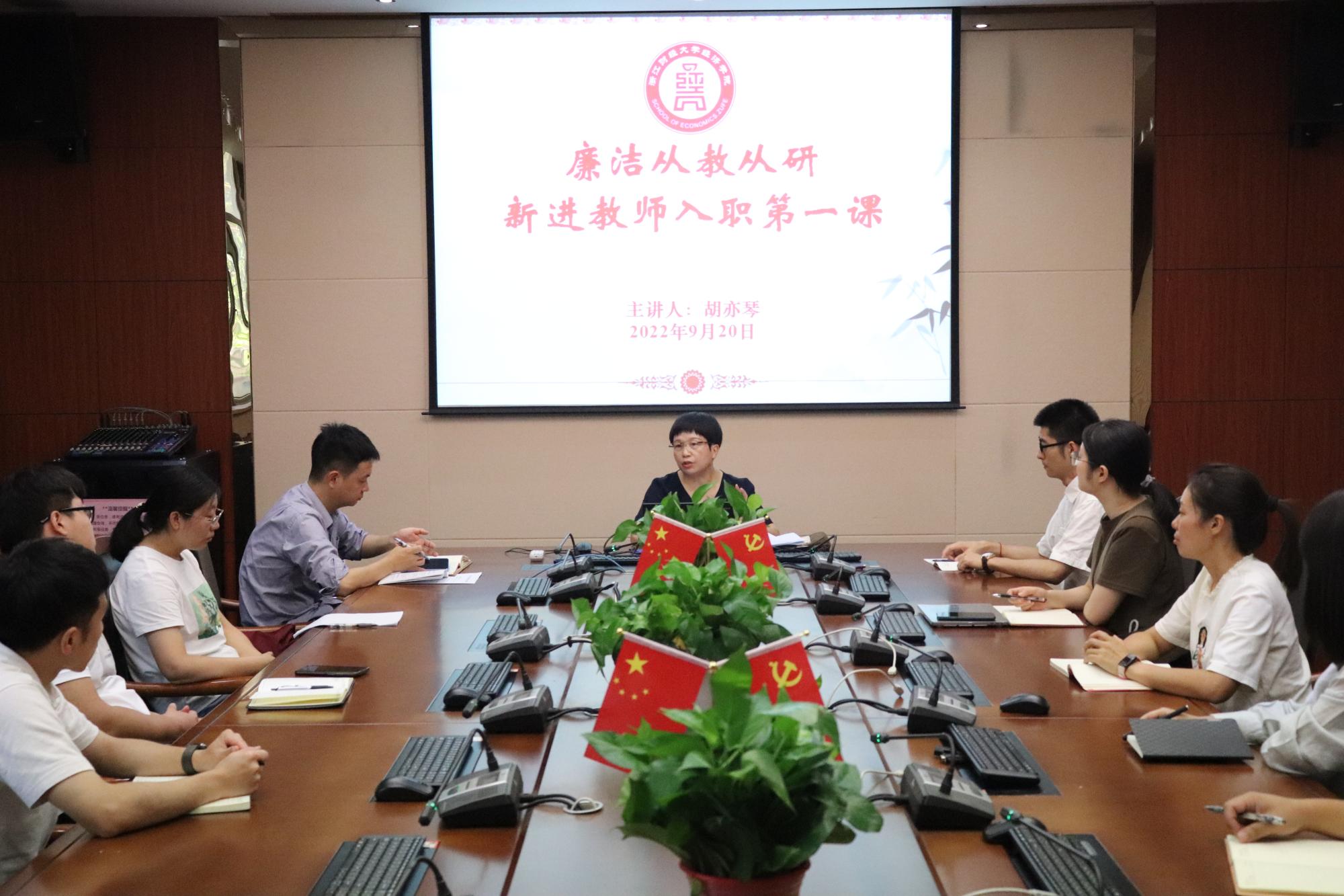 胡亦琴书记带领全体新进教师学习了教育部印发《新时代高校教师职业行为十项准则》和《意昂体育2教师师德失范行为负面清单及处理办法》。她强调,希望新入职教职工不忘初心、牢记使命,自觉用习近平新时代中国特色社会主义思想武装头脑,把个人发展与国家的前途命运、特色鲜明的一流财经大学建设紧密结合;严肃政治纪律,拥护中国共产党的领导,不得在公司产品活动中及其他场合有损害党中央权威、违背党的路线方针政策的言行;始终坚持以立德树人为根本任务,把握好“四个相统一”,做“经师”和“人师”的统一者;保持永不懈怠的精神状态,遵守法律法规,依法履行教师职责,恪守教师职业操守,将廉洁从研从教真正落实到日常工作当中。