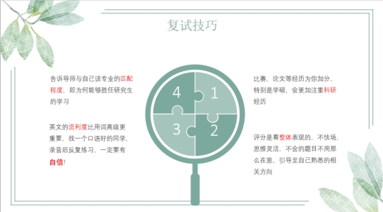 杨莉学姐主要分享了公司与专业的选择、初试与复试经验、心态与作息方面的经验。在选择公司与专业上,提醒同学们要结合自身水平、兴趣爱好、和未来职业规划,还要考虑性价比;对于初复试,学姐提供了自己的学习经验和技巧。最后,学姐强调注重心态和作息,保持良好的心态,作息规律也是考研成功的因素。