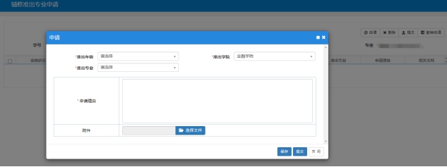 2.选择准出年级(注意:“准出年级”为毕业审核培养方案参照年级,非延长学制员工选“2019”,延长学制员工可选择招生年级或目前所在年级)和辅修准出专业,填写理由,提交申请。
