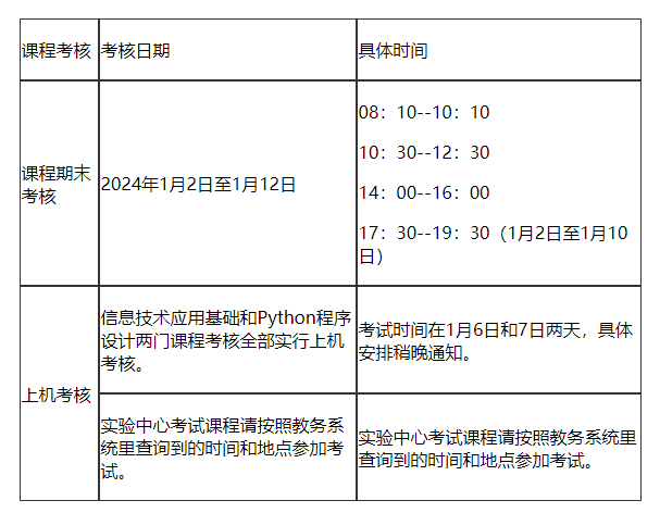 请登录教务系统【信息查询】查询个人考试信息,并按系统显示的考试时间和地点参加考核。其他课程如有变动,请以考试当天监考老师公布为准。课程考核时间也可在12月28日(下午四点之后)登录教务处网站-通知公告-校内通知查看具体通知,不按规定的时间地点参加考核,导致成绩缺失或成绩无法正常录入的,其后果由员工本人负责。请同学们留意各教学班级的通知,按时参加考试。
