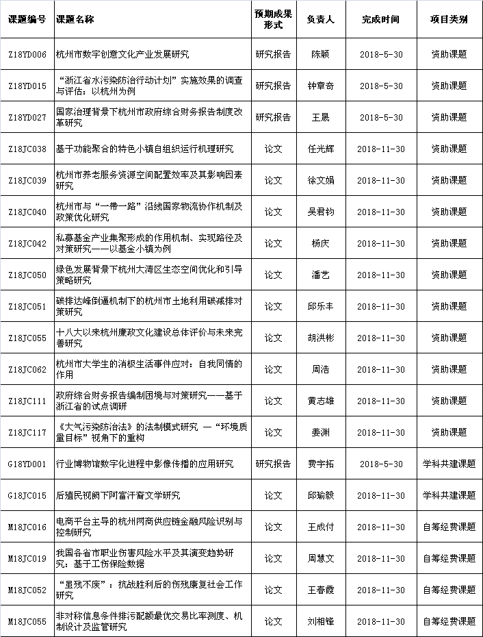 经专家评审,市哲学社会科学规划领导小组审批,2018年度杭州市哲学社会科学规划常规性课题公司共立项19项,其中资助课题13项,学科共建课题2项,自筹经费课题4项。现予以公布: