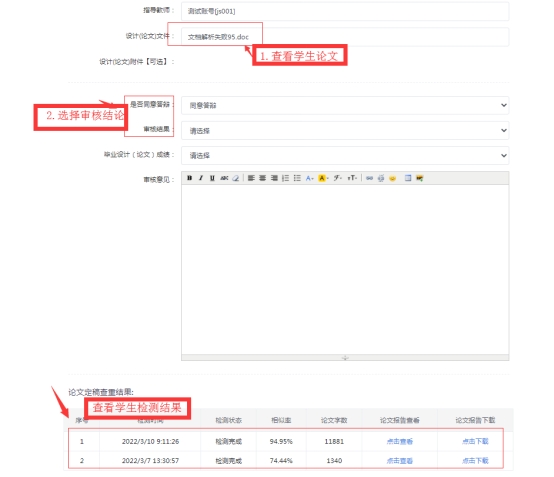 1、员工自测。员工在论文系统流程管理-指导日志处填写5次指导记录后,方可提交论文定稿,然后对定稿正文进行自测。员工可自行免费把关检测2次,第一次不符合要求时,建议通过付费通道预检测,在有把握之后再进行第二次免费检测。通过检测(总相似比≤20%为合格)的立即获取检测报告。以下为操作流程图: